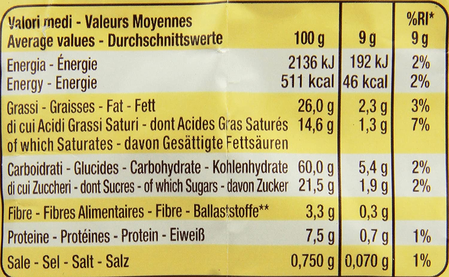 Zutaten: Keks: Weizenmehl, Zucker, Sonnenblumenöl, Eier, Magermilchpulver, pasteurisierte Vollmilch, Backtriebmittel (Ammoniumhydrogencarbonat, Natriumhydrogencarbonat, Monokaliumtartrat), Salz, Weizenstärke, Aroma, Haselnuss- und Kakaofüllung 26,5%: Zucker, pflanzliche Öle und Fette (Shea, Kokos, Kakao), Haselnüsse 6,4% im Endprodukt, Kakao 2,7% im Endprodukt, Magermilchpulver, Weizenstärke, Aroma.