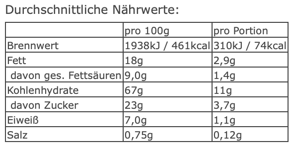 Zutaten: Weizenmehl 59,3, Zucker, Sonnenblumenöl, frische, pasteurisierte Vollmilch 5,9%, Reismehl 5,6%, Glukosesirup, Butter, frische Eier 1,3%, Backtriebmittel  (Ammoniumhydrogenkarbonat, Natrioumhydrogenkarbonat, Monokaliumtartrat), Salz, Aroma
