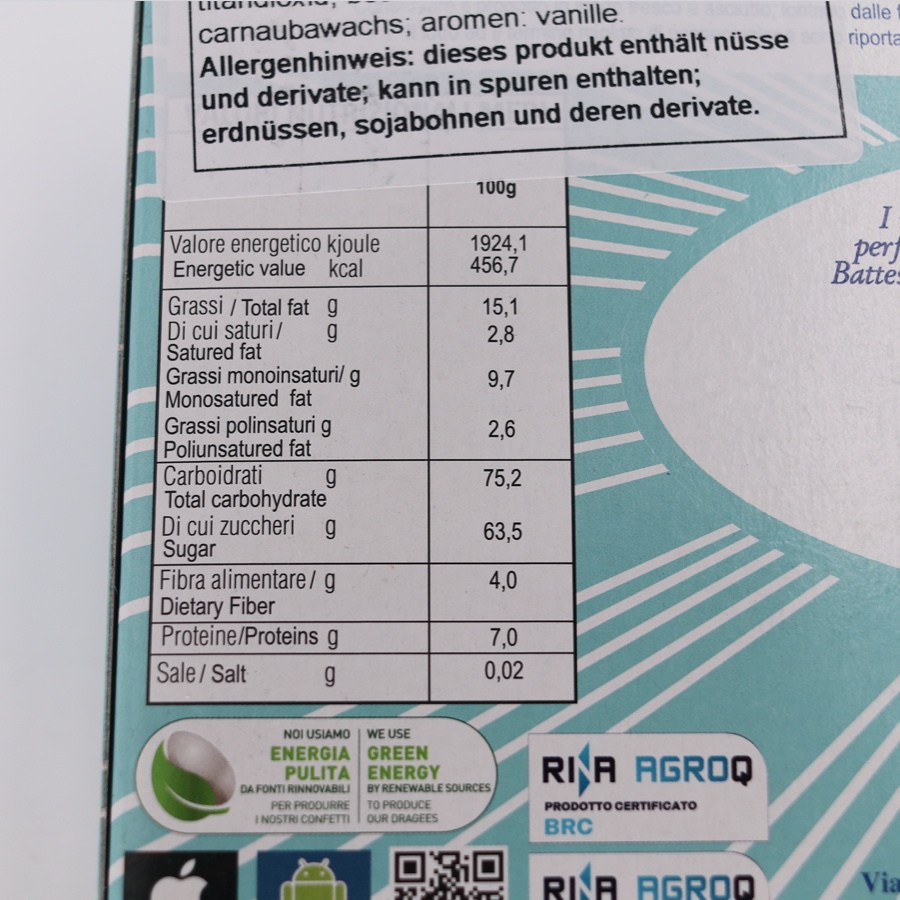 Allergeninformation: Das Produkt enthält Milch, Nüsse, Soja und Derivate. Es kann Spuren von Erdnüssen und Derivaten enthalten.
