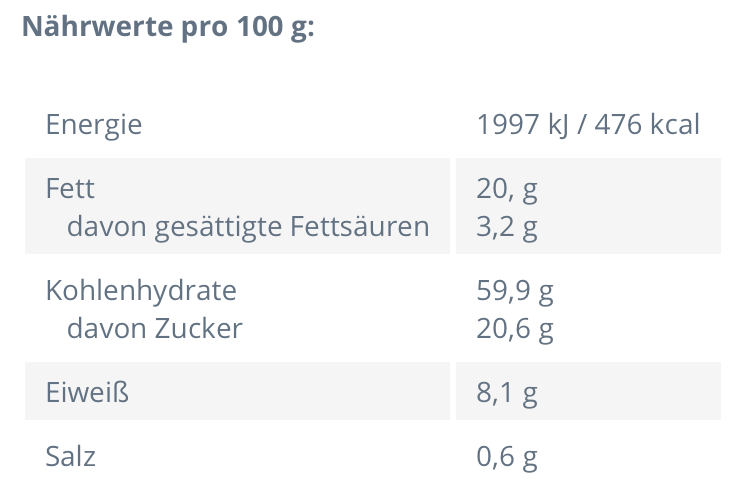 Zutaten: WEIZENVOLLKORNMEHL 46%, Zucker, Sonneblumenöl, Haselnüsse, Schokolade, frische EIER 9,5%, mischung von GETREIDE 5% : WEIZEN,