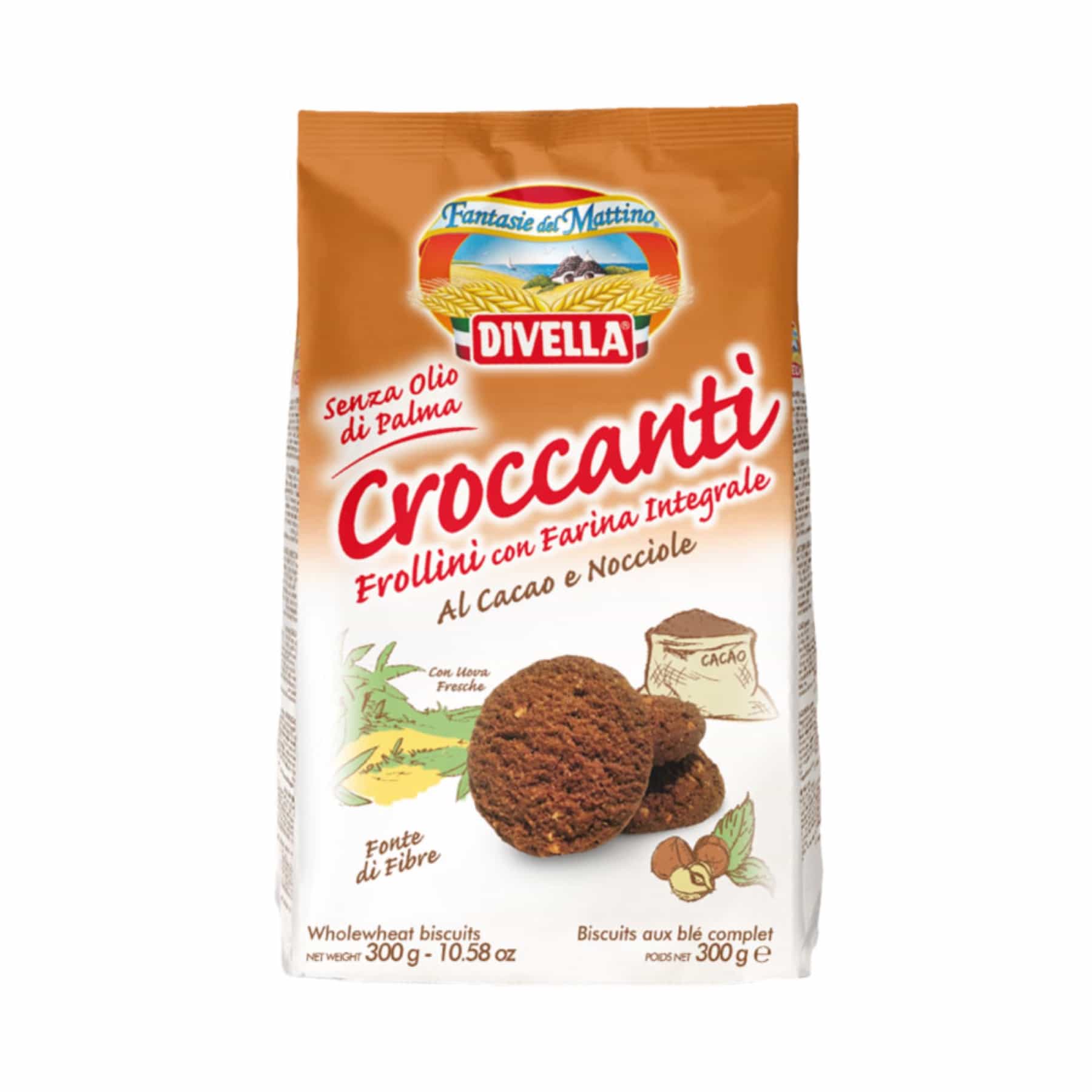 Croccanti Divella, hergestellt aus Vollkornmehl und Sonnenblumenöl, enthält Schokolade und Haselnüsse für einen noch köstlicheren Keks, der sich perfekt für jeden Anlass eignet