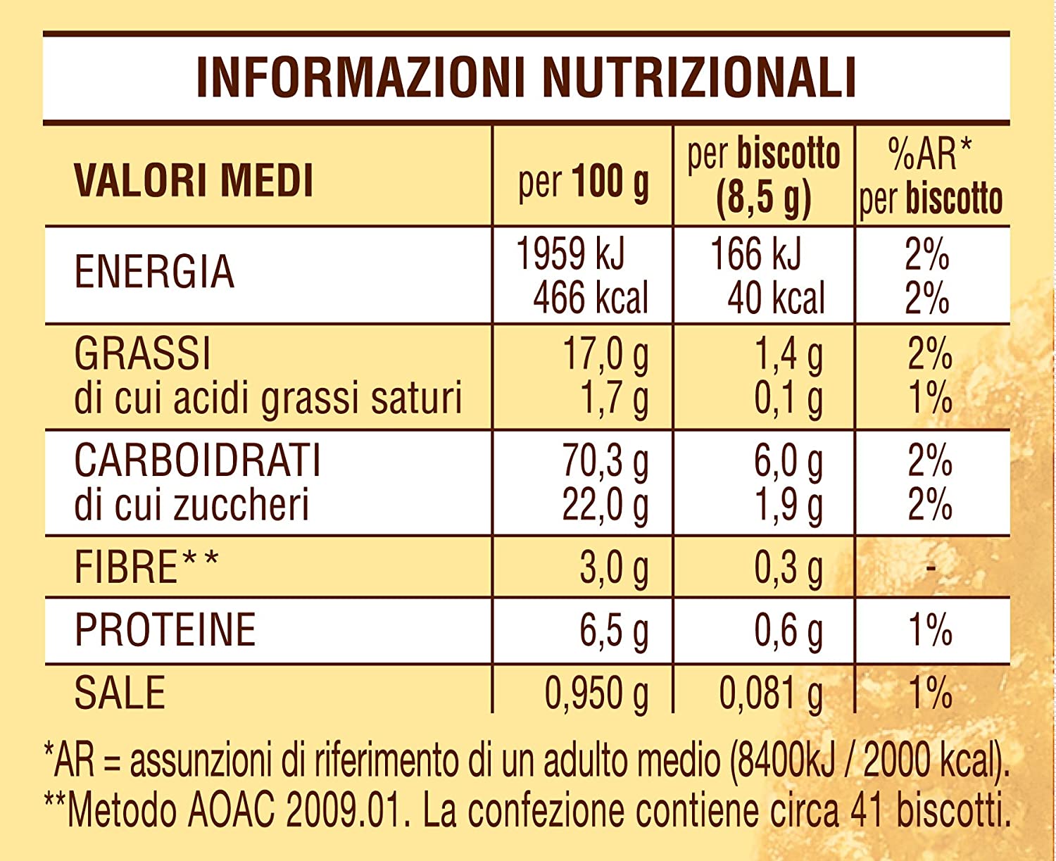 Zutaten: Weizenmehl, Zucker, ungehärtetes Pflanzenfett, Weizenstärke, Rohrzucker 3,6%, Magermilchpulver, Backtriebmittel (Ammoniumhydrogencarbonat, Natriumsäure, Natriumhydrogencarbonat), Sirup von Glucose-Fructose, Salz, Milchprotein, Vanille-Aroma.