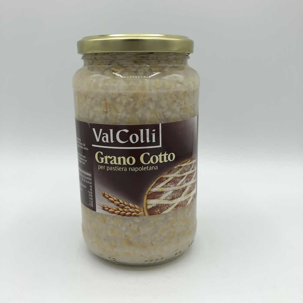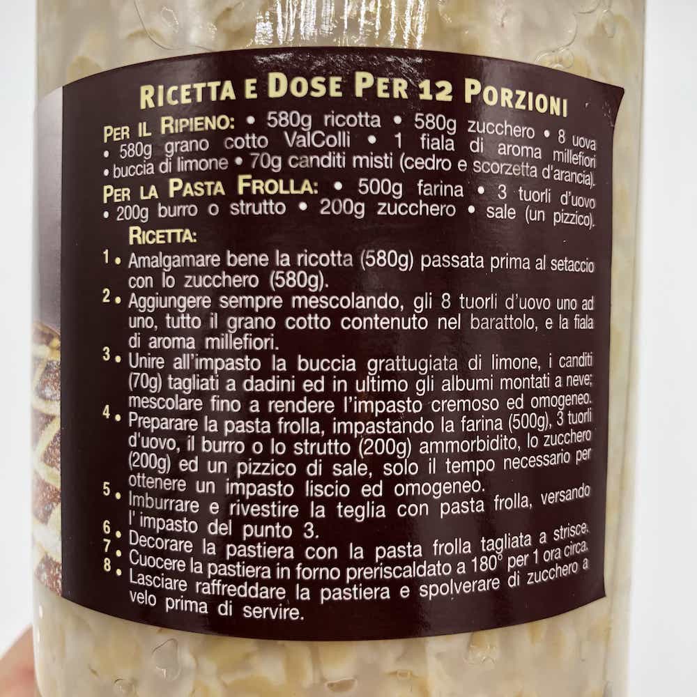 Grano Cotto von ValColli sind gekochte Weizenkörner für Pastiera Napoletana, die klassische Torte aus Neapel. Sie wird traditionell zu Ostern oder zu Pfingsten gemacht und daher oft auch als Osterkuchen oder Pfingsttorte bezeichnet, aber man findet sie ganzjährig in den Auslagen der Pasticcerie von Neapel. Auf dem Glas befindet sich ein Rezept für eine Pasta Frolla (italienischer Mürbeteig-Kuchen).