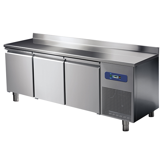 Innen und Außen aus Edelstahl. Abgerundete Innenecken. Isolierung aus Polyuhrethan. Isolierungsdichte: 50 mm. Automatisch schließende Türen mit magnetischer Dichtung. Kühltische nur in der TN-Ausführung erhältlich. Elektronisches vorderes Steuerpaneel. Umluftkühlung. Serienmäßig tropikalisiertes Aggregat (Raumtemperatur +43°C / rel. Luftfeuchtigkeit 65%). Völlig automatische Abtauung und Tauwasserverdunstung. Höhenverstellbare Füße aus Edelstahl.