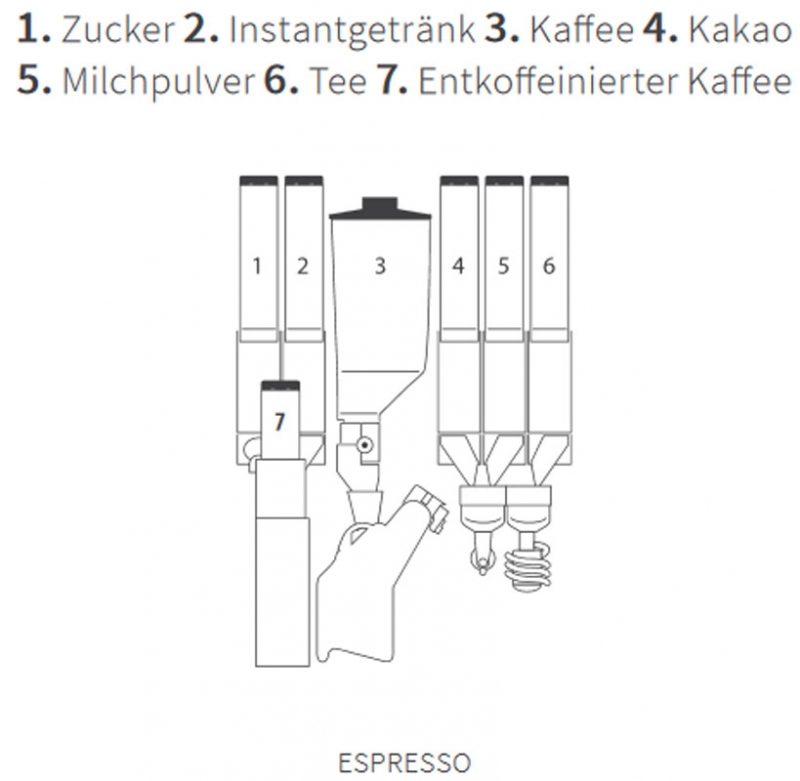 Espresso Kaffee in Bohnen* 3.8 kg Gefriergetrockneter Kaffee 0.70 Kg Gerstenkaffee 0.75 Kg Milchpulver 2,20 kg Kaffeeweisser 4,00 kg Kakao 4.80 kg Zitronentee 5,20 kg Tee 2,40 kg Brühe 3,80 kg Zucker 5,20 kg Rührstäbchen 600 St. Becher** 600 St. *Mit Einbau Kit Erweiterung 4.50 Kg.