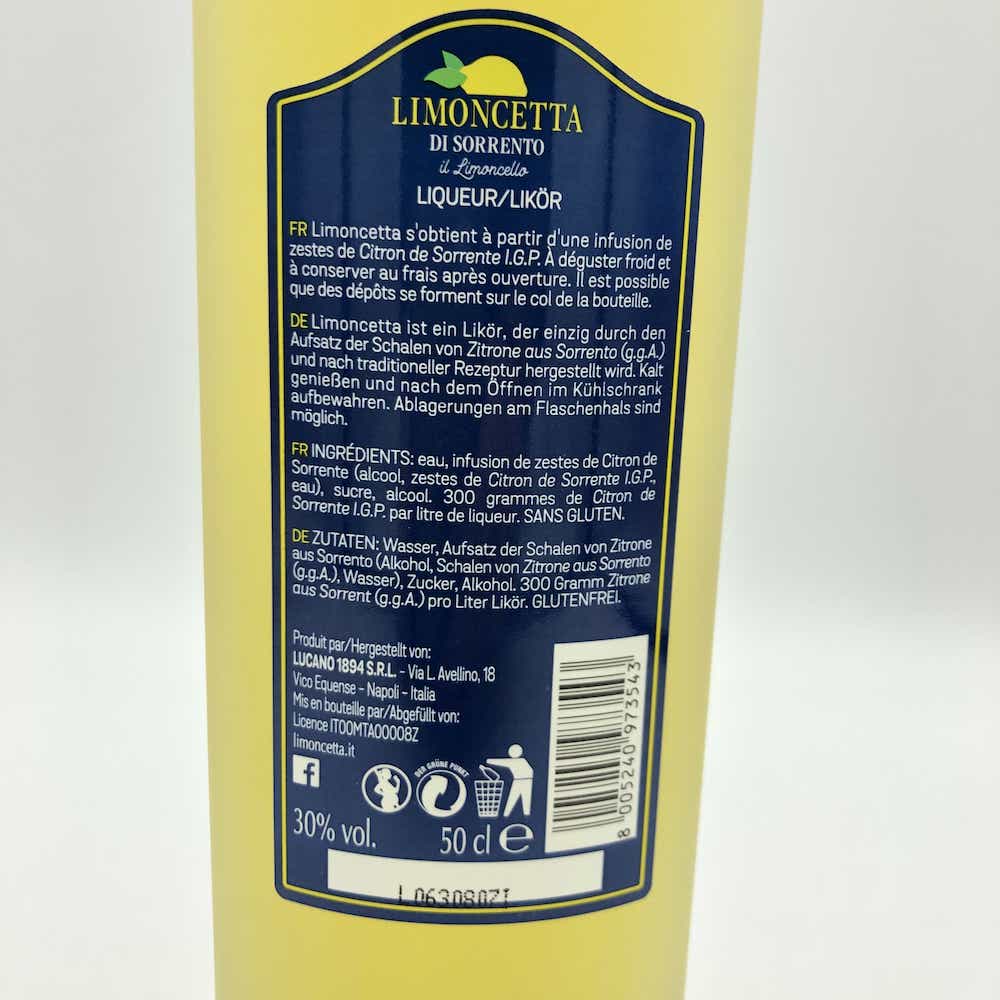 Zutaten: Wasser, Aufsatz der Schalen von Zitrone aus Sorrento, (Alkohol, Schalen von Zitrone aus Sorrento, Wasser), Zucker, Alkohol