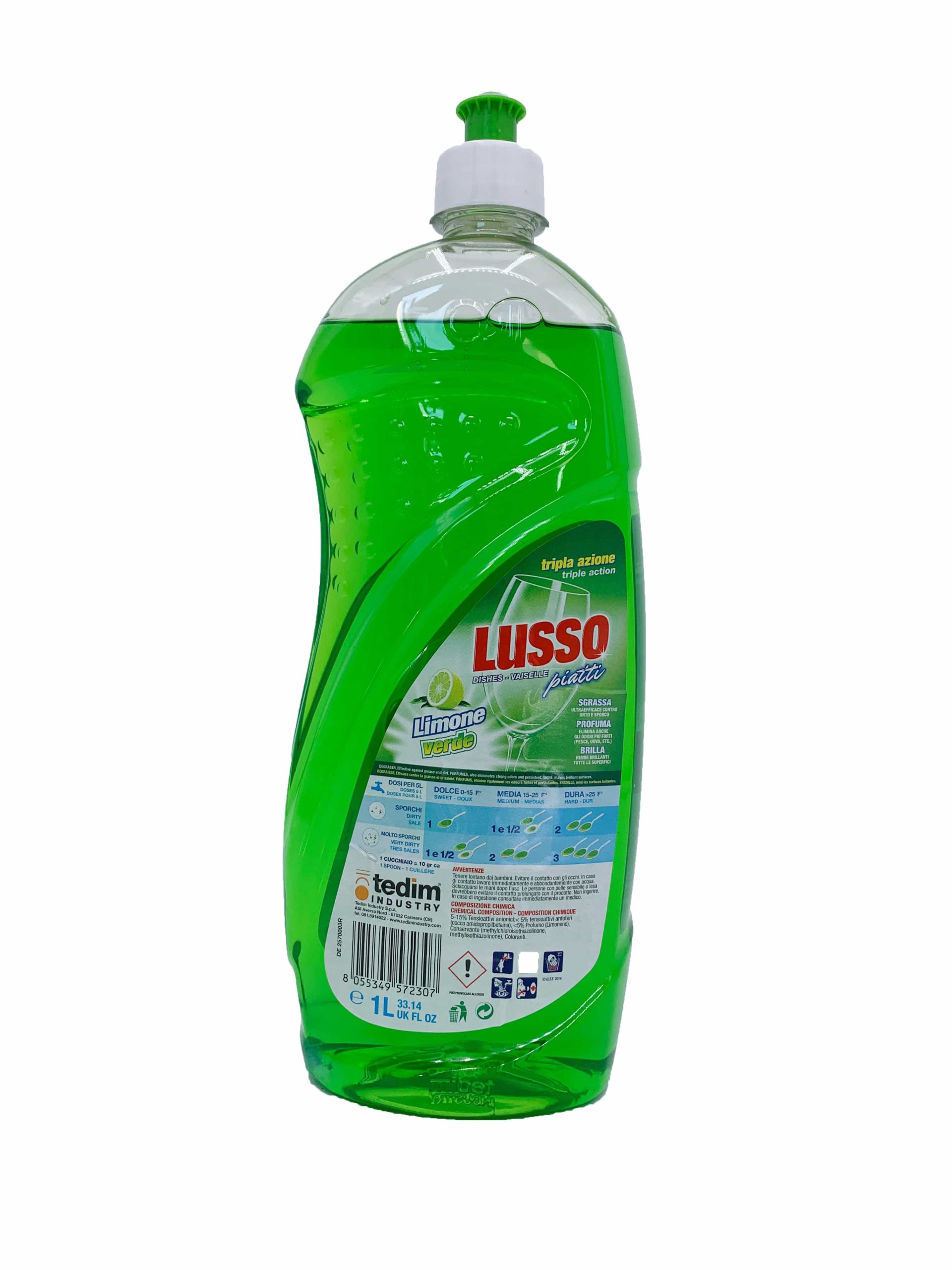 Das Lusso piatti Spülmittel sticht besonders durch seinen exotischen Duft von grünen Limetten heraus. Es entfernt Fett und Stärkereste mühelos und sorgt für glänzend sauberes Geschirr.
