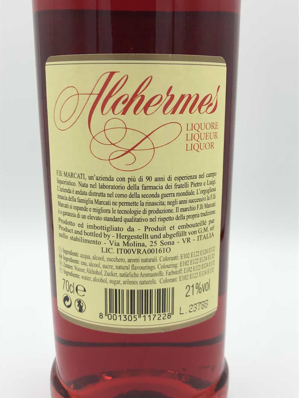 Der Alchermes von Mercati ist ein italienischer aromatisierter Kräuterlikör gewonnen aus Zucker, Zimt Gewürnelken, Kardamon, Vanille und Rosenwasser. Seine Farbe erhält er durch den Farbstoff Kermes. Der Likör wird gerne zum Färben von Speisen verwendet zum Beispiel für Zuppa inglese. Aber auch zum Tränken von Tortenböden eignet sich der Alchermes Likör hervorragend.