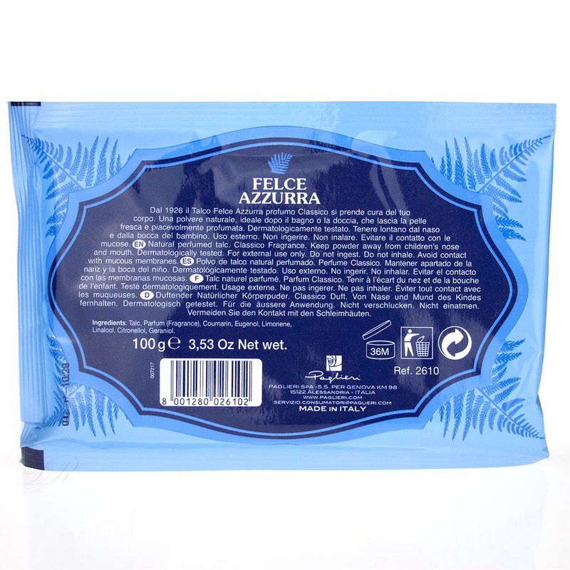 Das Paglieri Felce Azzurra Körperpuder verleiht Ihnen ein ungemein seidiges Hautgefühl. Talco Felce Azzurra wird aus 50 verschiedenen Ölen in alter Handwerkskunst hergestellt.