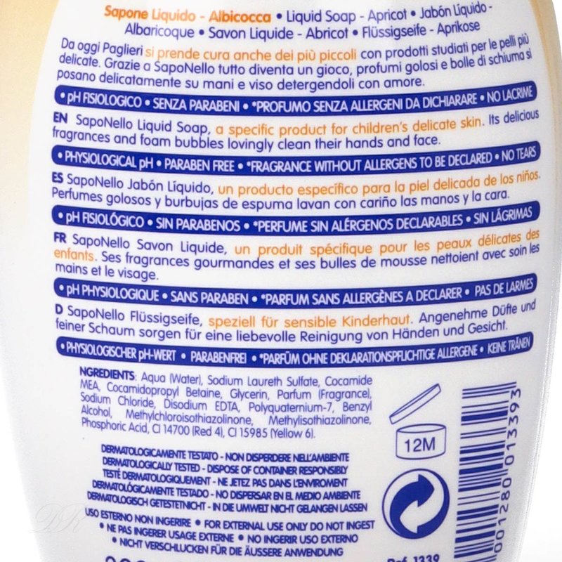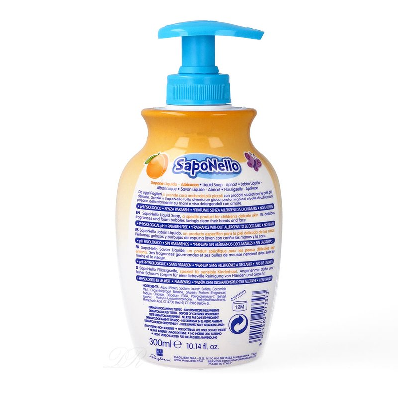 Die Saponello Flüssigseife von Paglieri in der Duftrichtung Aprikose bringt den Kleinen Spaß beim täglichen Händewaschen. Nicht nur der fruchtige Duft und der weiche Schaum sorgen für gute Laune, sondern auch das fröhliche Design des Seifenspenders. Mit dieser Flüssigseife lernen Kinder spielerisch, wie wichtig es ist, sich täglich gründlich die Hände zu waschen.