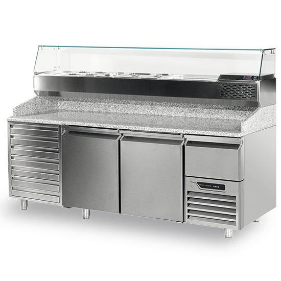 Pizzatisch 2230 mm mit 2 Türen 600×400 mm + 7 Schubladen 40×60 cm und Kühlaufsatzvitrine 10x GN 1/3