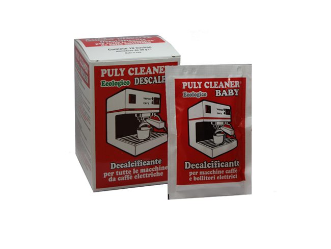 Puly Cleaner Baby Descaler Entkalkungsmittel im Portionsbeutel als Entkalkungspulver für Kaffeemaschinen und elektrische Wasserkocher. Verwenden Sie für die regelmäßige Entkalkung Ihrer Espressomaschine oder des Wasserkochers das Entkalkerpulver Puly Cleaner Baby Descaler. Das Entkalkungsmittel im Portionsbeutel löst sich leicht in Wasser auf und läßt sich einfach handhaben. Eine regelmäßige Entkalkung ist auch bei der Verwendung eines Wasserfilters oder von Wasserfilterbeuteln und auch beim Einsatz einer Entkalkungsanlage notwendig, um die Bildung von Kalkablagerungen im Gerät zu reduzieren und um die Bildung des hartnäckigen Kesselsteins im Kessel der Espressomaschine oder im Wasserkocher zu vermeiden.