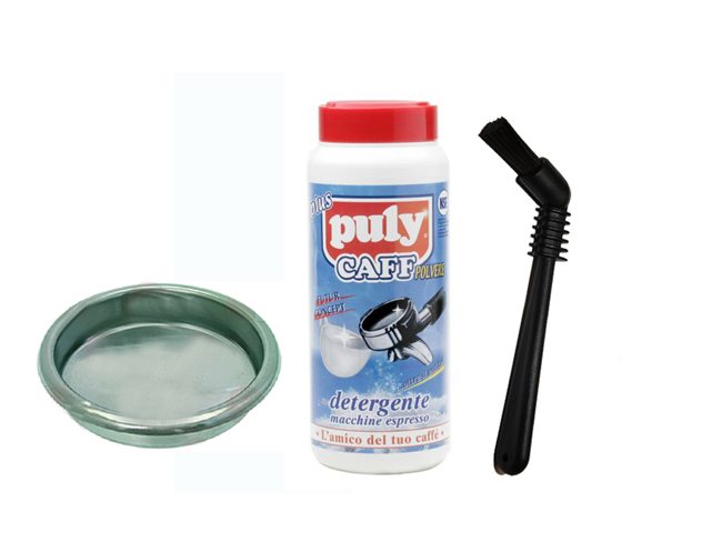 Bestehend aus einem Blindsieb, einer Gruppenbürste und dem Puly Caff Fettreiniger (900g), enthält es alle nötigen Werkzeuge für eine schnelle und einfache Reinigung des Kaffeevollautomaten.