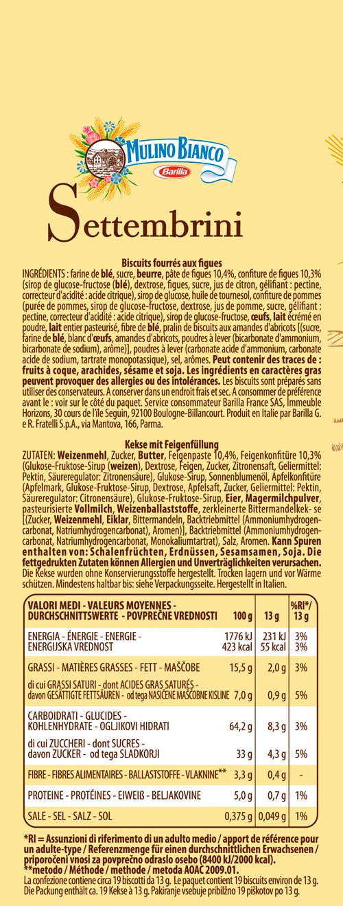 Zutaten: Weizenmehl, Zucker, Palmöl, Feigenpaste 10,4%, Feigenkonfitüre 10,3% (Glukose-Fruktose-Sirup (Gluten), Dextrose, Feigen, Zucker, Zitronensaft, Geliermittel: Pektin, Säureregulator: Zitronensäure), Glukose-Sirup, Butter, Apfelkonfitüre (Apfelmark, Glukose-Fruktose-Sirup, Dextrose, Apfelsaft, Zucker, Geliermittel: Pektin, Säureregulator: Zitronensäure), Glukose-Fruktose-Sirup, Eier, Magermilchpulver, pasteurisierte Vollmilch, zerkleinerte Bittermandelkekse [(Zucker, Weizenmehl, Eiklar, Bittermandeln, Backtriebmittel (Ammoniumhydrogencarbonat, Natriumhydrogencarbonat), Aromen)], Backtriebmittel (Ammoniumhydrogencarbonat, Natriumhydrogencarbonat, Monokaliumtartrat), Salz, Aromen