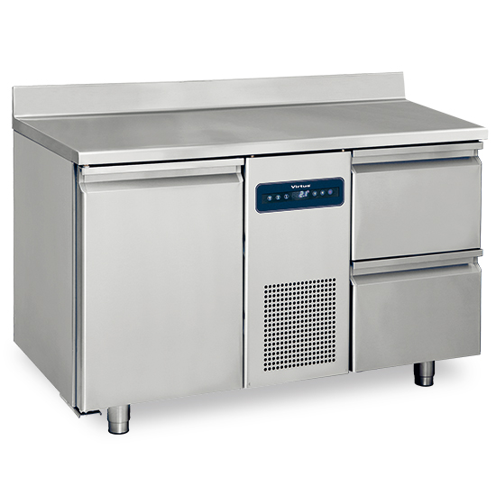 Pizzatisch 1660 mm mit 2 Türen 40×60 cm + 1 Schublade und Kühlaufsatzvitrine 6x 1/2 + 1x 2/8 GN